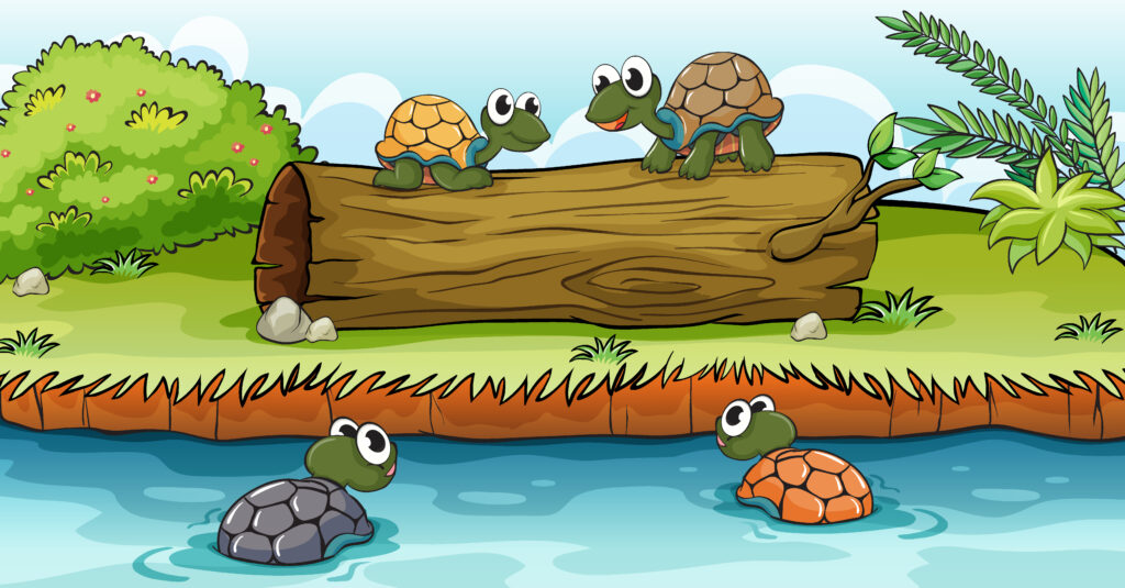 inmitten eines dichten Waldes lebte eine Schildkröten-Familie. Die Familie bestand aus acht Schildkröten: Vater Schildkröte, Mutter Schildkröte, Tante und Onkel Schildkröte. Dann gab es noch drei kleine Schildkröten-Kinder. Die Eltern waren stolz auf ihre Kinder, die sehr schlau waren. Jeden Tag erkundeten sie gemeinsam die Umgebung und lernten die verschiedenen Tiere und Pflanzen kennen, die im Wald lebten.