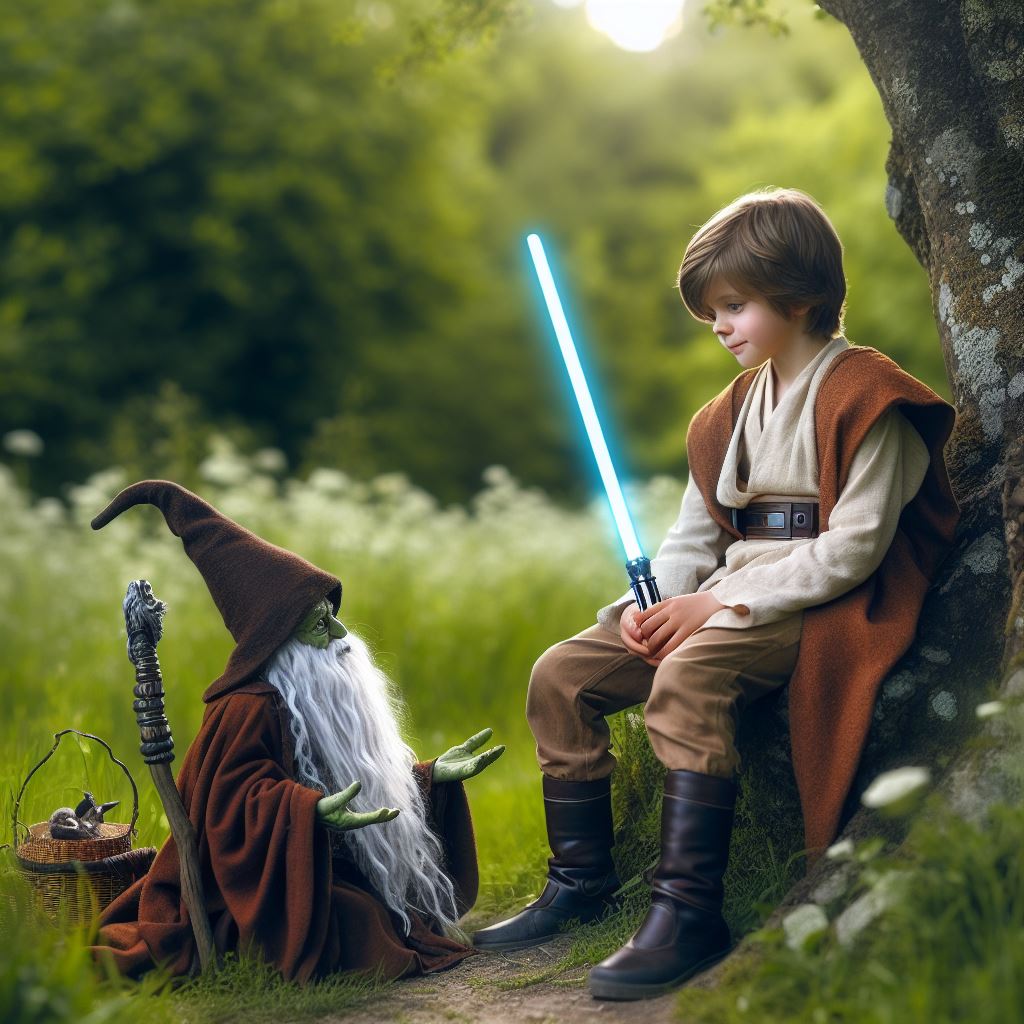 als er bei schönem Wetter wieder mit seinem Laserschwert auf der Wiese war und etwas müde vom Trainieren wurde, setzte er sich unter den Baum und träumte vor sich hin.