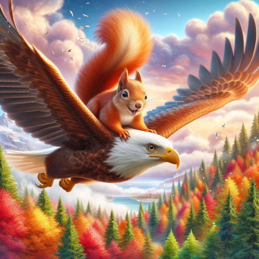 Eines Tages hörte Hilda ein leises Flattern über sich und sah einen majestätischen Adler, der über ihr schwebte. Hilda hatte Angst vor dem Adler und versteckte sich schnell hinter einem Ast. Der Adler bemerkte Hilda und fragte ihn, warum er sich versteckte. Hilda erzählte dem Adler von seiner Höhenangst und, dass sie nicht wie die anderen Eichhörnchen auf den Bäumen herumklettern konnte.